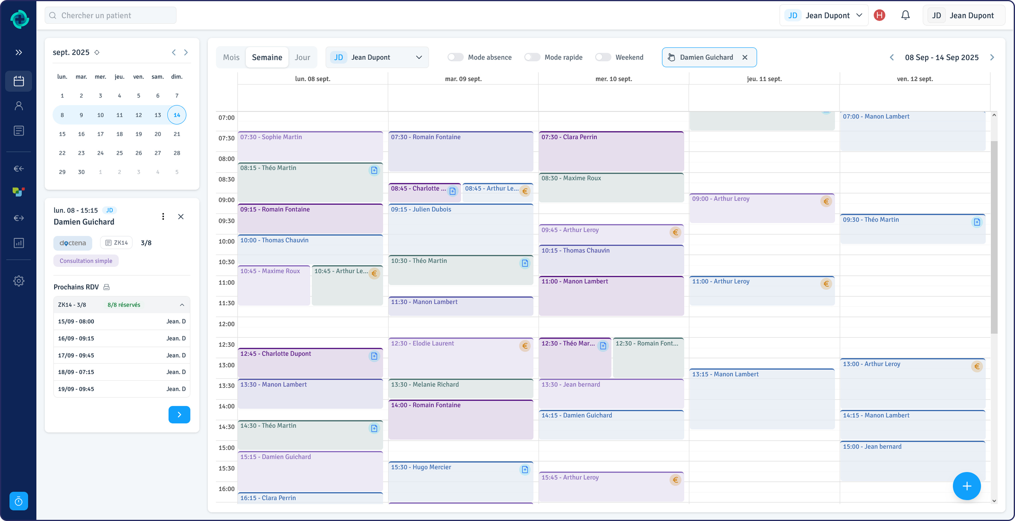 La gestion des rendez-vous et des absences est entièrement modulable : vous pouvez ajouter, annuler ou modifier vos rendez-vous et absences en quelques clics. Pour les secrétaires et assistants, le mode rapide permet de saisir rapidement un grand nombre de rendez-vous, optimisant ainsi le temps passé à organiser le planning.